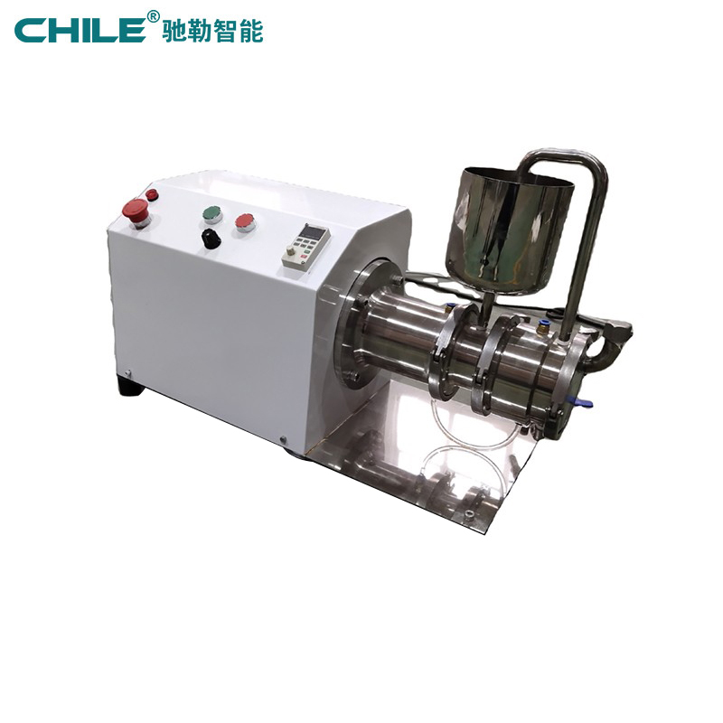 實(shí)驗(yàn)室臥式砂磨機(jī)的電機(jī)驅(qū)動(dòng)內(nèi)部送料裝置高速旋轉(zhuǎn),形成負(fù)壓,通過自吸作用,將置于上方料罐內(nèi)的物料吸入并送至研磨腔。腔內(nèi)高填充率研磨介質(zhì)受到撥盤旋轉(zhuǎn)帶動(dòng)產(chǎn)生各個(gè)方向的力并不規(guī)則運(yùn)動(dòng),物料中的顆粒受到研磨介質(zhì)不斷的碰撞及摩擦,同時(shí),篩網(wǎng)使物料和研磨介質(zhì)分開,物料不斷的從料罐到研磨腔循環(huán)流動(dòng),實(shí)現(xiàn)粒徑變小,粒徑范圍變窄的目的,料缸和夾套可采用冷卻裝置,終保證高品質(zhì)的產(chǎn)品。