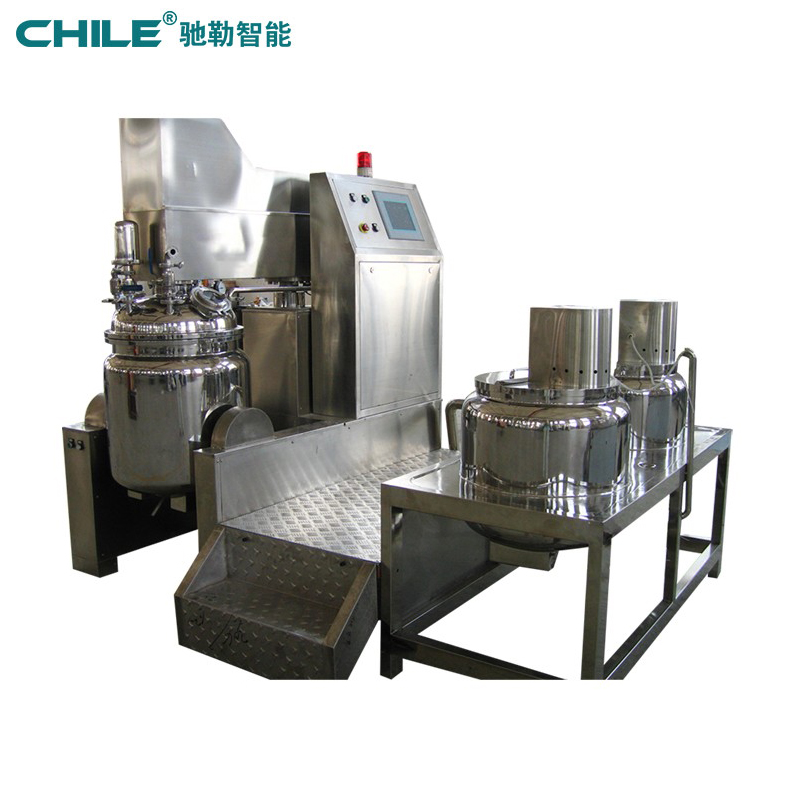 在高粘性乳化物,特別是膏霜,軟膏,乳劑類產(chǎn)品的工藝中,通常造成問題的是分散相的粒徑大和攪拌時(shí)把空氣混入制品中,粒徑過大導(dǎo)致乳狀物不穩(wěn)定,缺少光澤,制品中混入空氣則會(huì)使制品氣泡化,細(xì)菌污染,易氧化及外觀不光滑。針對(duì)兩大問題,我公司出的真空均質(zhì)乳化機(jī)組,由均質(zhì)攪拌器,中心葉片攪拌,刮壁攪拌各自具有的特點(diǎn)相輔相成,組合成科學(xué)的攪拌方式,以達(dá)到完美混合制品。采用抽真空的方式,使所的制品在攪拌過程中不再混入氣泡,從而保證可出富有光澤,細(xì)膩及延展性良好的產(chǎn)品。