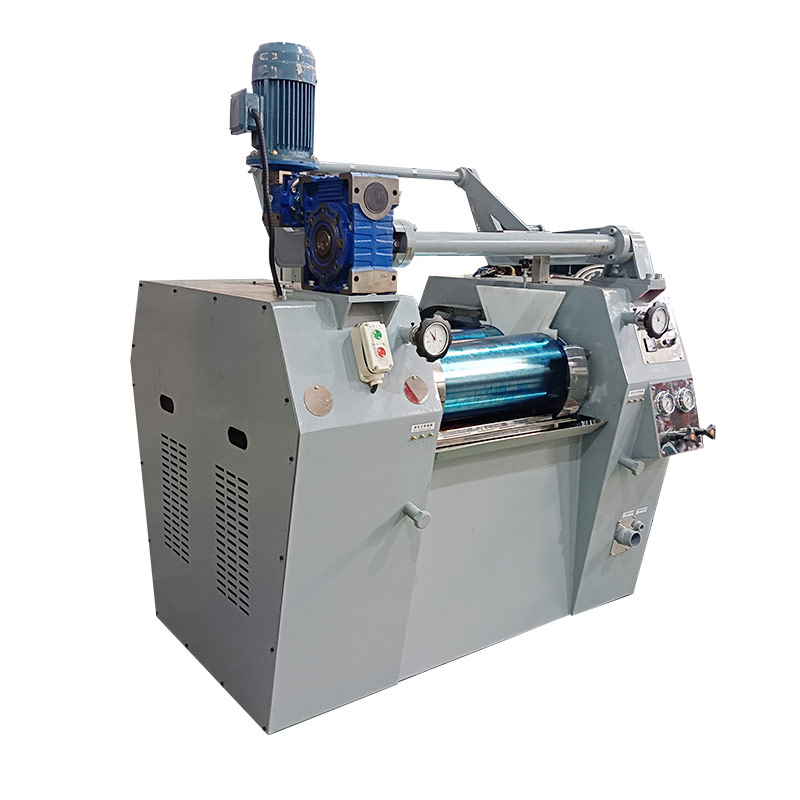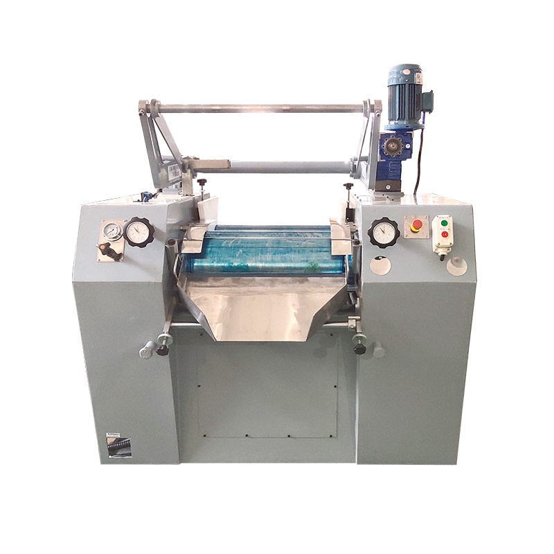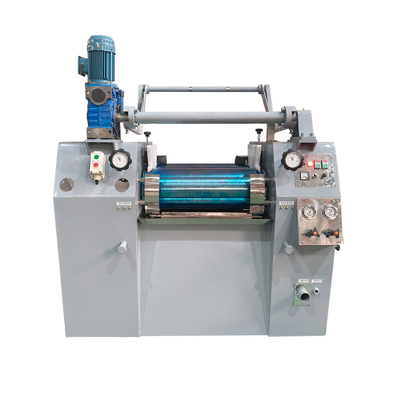 加料裝置把所需研磨的物料倒入慢輥與中輥進(jìn)行第一次擠壓研磨,再轉(zhuǎn)入與快輥?zhàn)鞯诙窝心?,?jīng)二次研磨后,由出料刀片鏟下,完成一個(gè)工作過(guò)程。物料在三根輥筒之間多次地被混合、研磨從而達(dá)到物料的細(xì)度等要求。研磨的次數(shù)與細(xì)度,一般與物料的質(zhì)量與前道工序的好壞有直接的關(guān)聯(lián)。