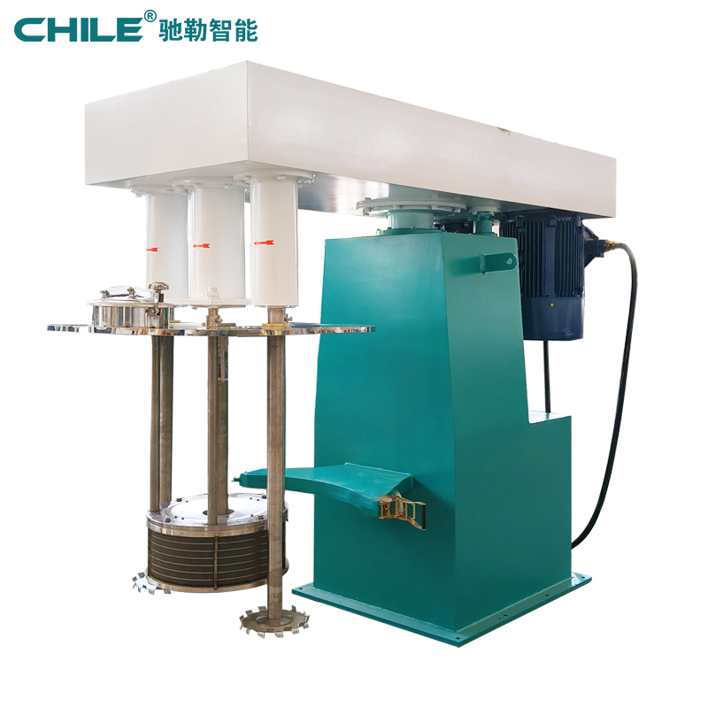 液壓升降籃式研磨機(jī)電機(jī)運(yùn)轉(zhuǎn)帶動(dòng)撥桿和底部分散盤高速旋轉(zhuǎn),使分散盤上部及籃腔內(nèi)部形成真空,漿料被吸入籃式研磨腔內(nèi)。撥桿驅(qū)動(dòng)腔內(nèi)的研磨介質(zhì)產(chǎn)生向各個(gè)方向的力,物料中的顆粒受到介質(zhì)不斷地碰撞及摩擦,粒徑變小,粒徑范圍變窄;分散盤的高速運(yùn)轉(zhuǎn),產(chǎn)生渦流將腔內(nèi)物料抽吸出來,再循環(huán)至進(jìn)料,具有非常顯著的分散混合效果,通過液壓泵工作驅(qū)動(dòng)液壓柱塞升降,帶動(dòng)整個(gè)傳動(dòng)機(jī)構(gòu)和研磨裝置升降。
